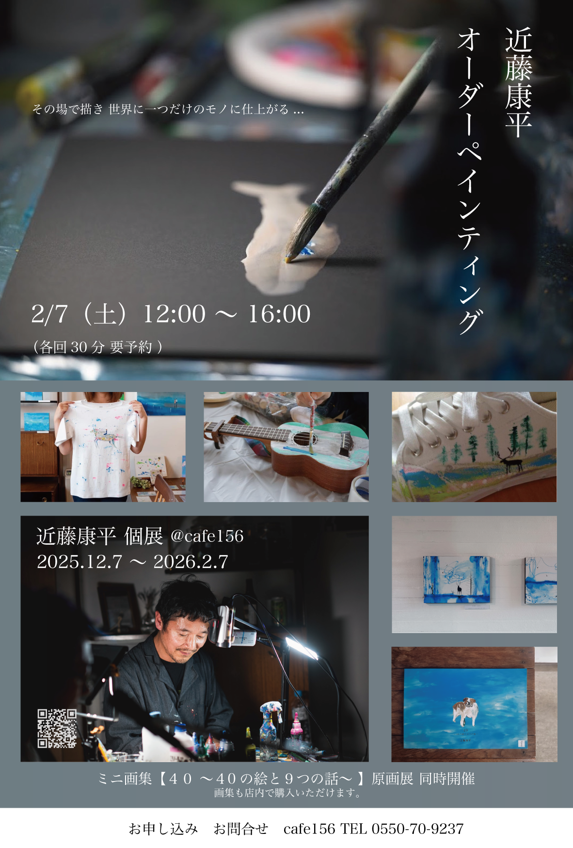 近藤康平個展 @cafe156event&workshop , …January 10, 2026いつもcafe156をご利用いただきありがとうございます。 2025年12月7日から2026年2月7日まで いつも素敵なライブや個展をcafe156でも愉しませてくださる 近藤康平さんの個展を店内にて開催中です。 ミニ画集【49〜40の絵と9つの話し】も店内でぜひご覧ください。 そして、最終日の2月7日はオーダーペインティングも開催します!! 【その場で世界にたった一つのものが仕上がる・・・】 お申し込みも受付中です。 ご来場心よりおまちしております。